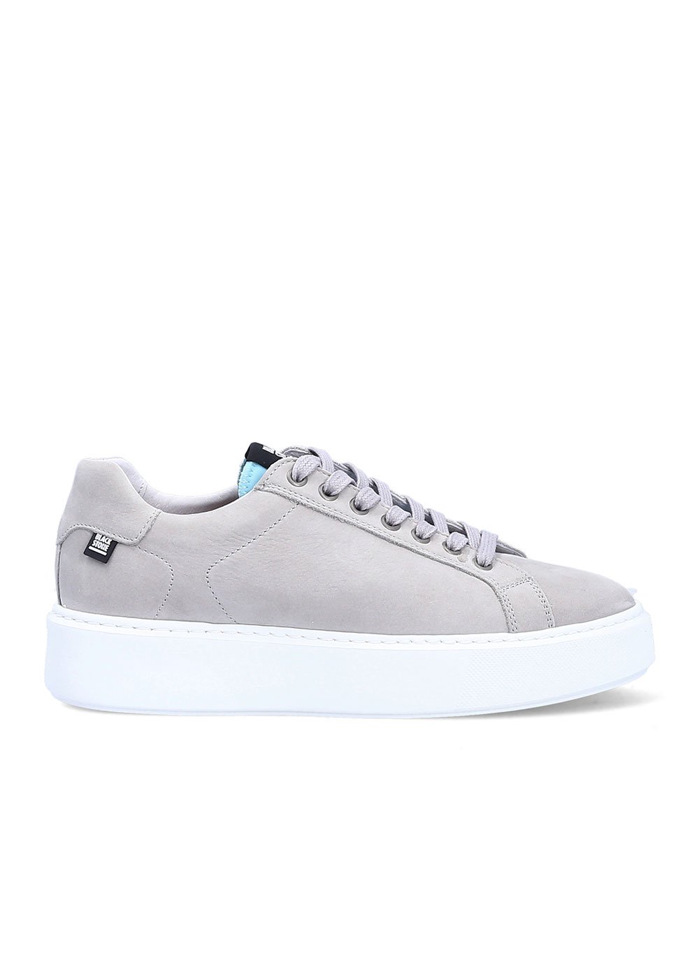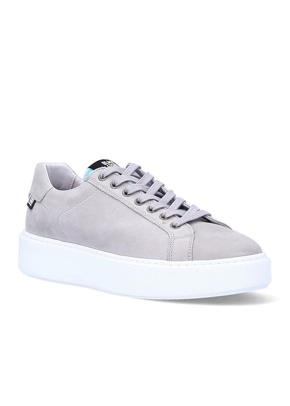 Tennis XL21 Blackstone en cuir gris clair avec parie ciel sur la languette. Une allure citadine et mode pour cette basket à semelle épaisseblanche en caoutchouc.